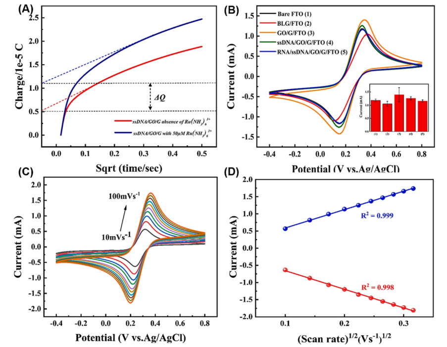 圖4. (A)用計時庫侖法測定探針密度。(B)不同電極修飾步驟對在0.1 M KCl/10 mM K3Fe(CN)6中進行的CV的影響(插圖表示修飾電極的電流響應)。(C)在含有100 nM氧化還原探針的溶液中,在10-100mV s-1的不同掃描速率下的GO/G/FTO的CV曲線,(D)平方根掃描速率與峰電流之間的相應相關性。