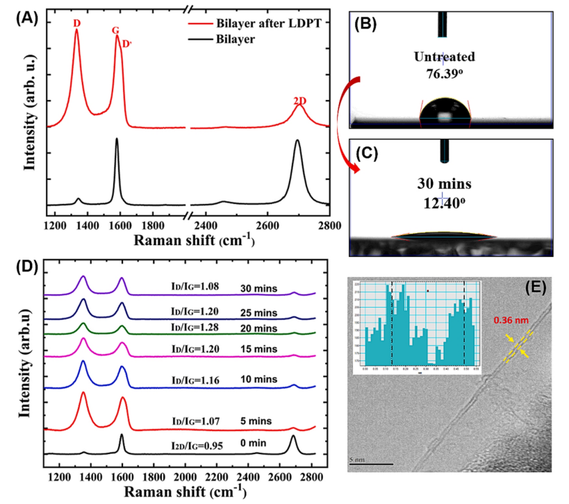圖1. 等離子體改性前后BLG的(A)拉曼光譜和(B,C)水接觸角。(D)經受不同時間等離子體改性的GO/G結構的拉曼光譜。(E)界面分析的GO/G的TEM圖像。