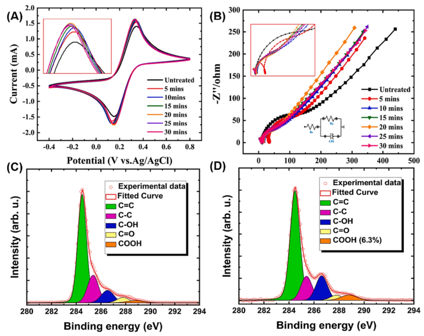 圖2. (A) (A)在0.1 M KCl/10 mM K3Fe(CN)6的電解質溶液中進行的不同時間等離子體修飾下的GO/G結構的循環(huán)伏安法分析和(B)交流阻抗分析。(C和D)等離子體改性處理前后BLG的XPS分析(20分鐘)。