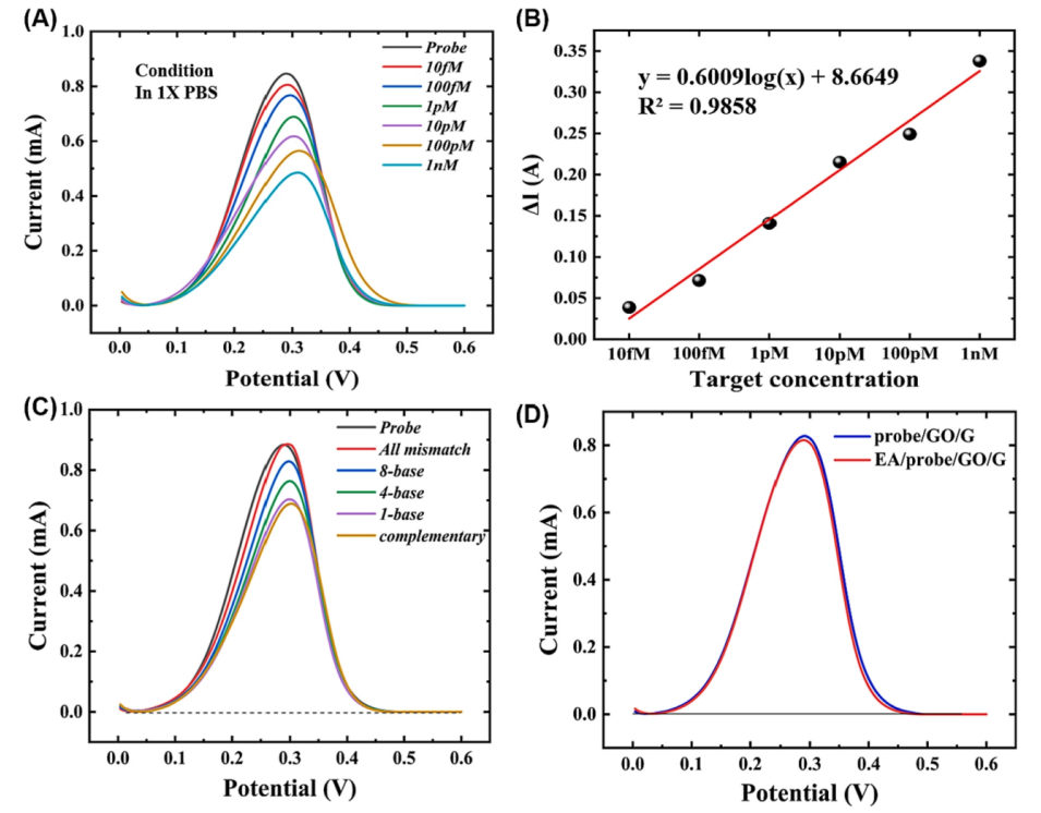圖5. (A)使用PBS溶液中的GO/G結構,從1 nM到10 fM的不同濃度的miRNA-21的DPV曲線,和(B)miRNA-21濃度和峰電流之間的校準圖。(C)在濃度為1 pM的PBS溶液中,存在具有不同堿基配對錯誤的序列時miRNA-21的DPV曲線,以及(D)被乙醇胺封閉的活性位點和固定的探針信號的DPV比較。