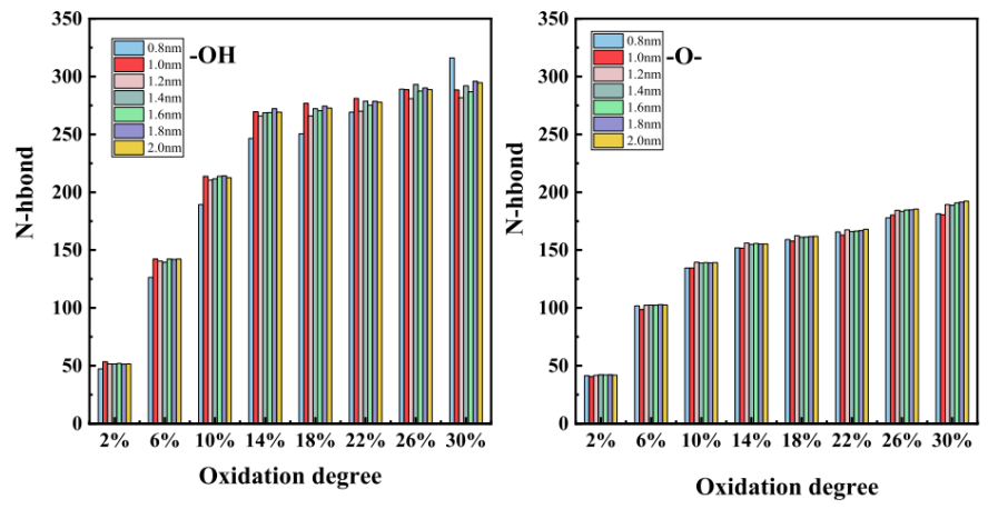 圖6. 在不同氧化程度的GO納米片上的( a)水分子和羥基之間,以及(b)水分子和環(huán)氧基之間形成的氫鍵總數(shù)。