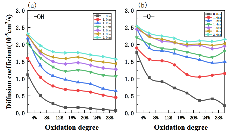 圖2. 不同層間距和氧化程度下(a)-OH基團(tuán)和(b) -O-基團(tuán)修飾的不同GO膜間的水分子擴(kuò)散系數(shù)。