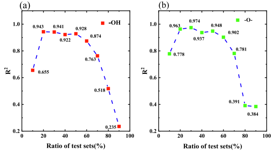 圖3. 模型參數(shù)的優(yōu)化過程:測試集各種比例的R2分?jǐn)?shù):(a)-OH基團(tuán);(b) -O-基團(tuán)。