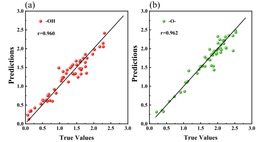 圖4. 當(dāng)GO被(a)羥基(-OH)和(b)環(huán)氧基(-O-)修飾時,MD(水平)計算值和XGBoost(垂直)預(yù)測值之間的水?dāng)U散系數(shù)相關(guān)圖。