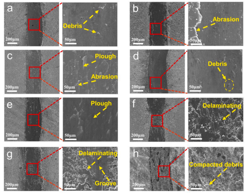 圖5. Ag-G復合涂層在(a)-70°C、(b)-25°C、(C)-15°C、(d)-5°C、(e)25°C、(f)45°C和(G)90°C不同硫化溫度下168 h后的磨損形貌。(h)在硫化溫度25°C下168小時的純銀涂層的磨損形態。