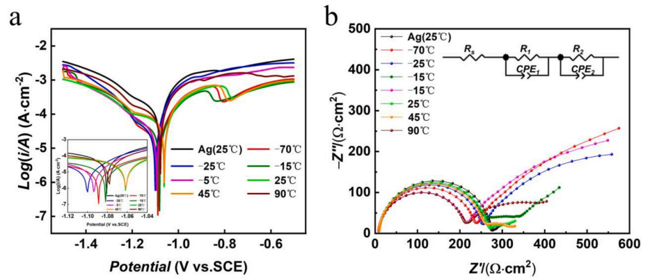 圖7. (a)純Ag和Ag-G復合鍍層在不同硫化溫度下168 h后的Tafel極化曲線和(b)電化學阻抗譜曲線。