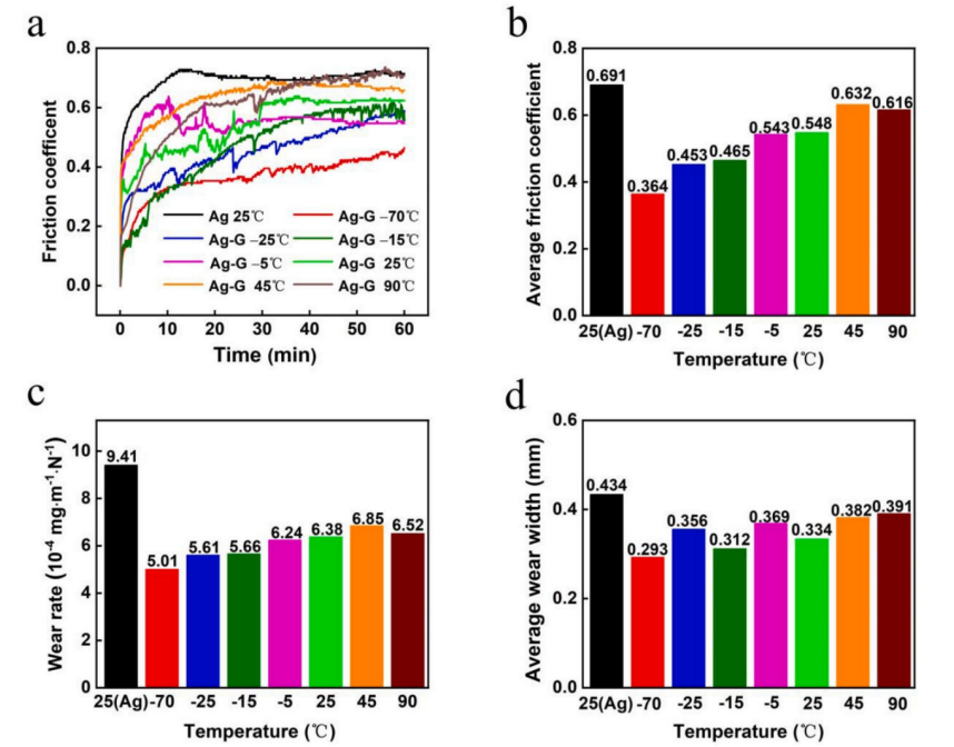 圖4. (a)純Ag和Ag-G復合涂層在不同硫化溫度下168小時后的摩擦系數變化;(b)硫化168小時后制備涂層的平均摩擦系數;(c)硫化168小時后制備涂層的磨損率;(d)硫化168小時后制備涂層的平均磨損寬度。