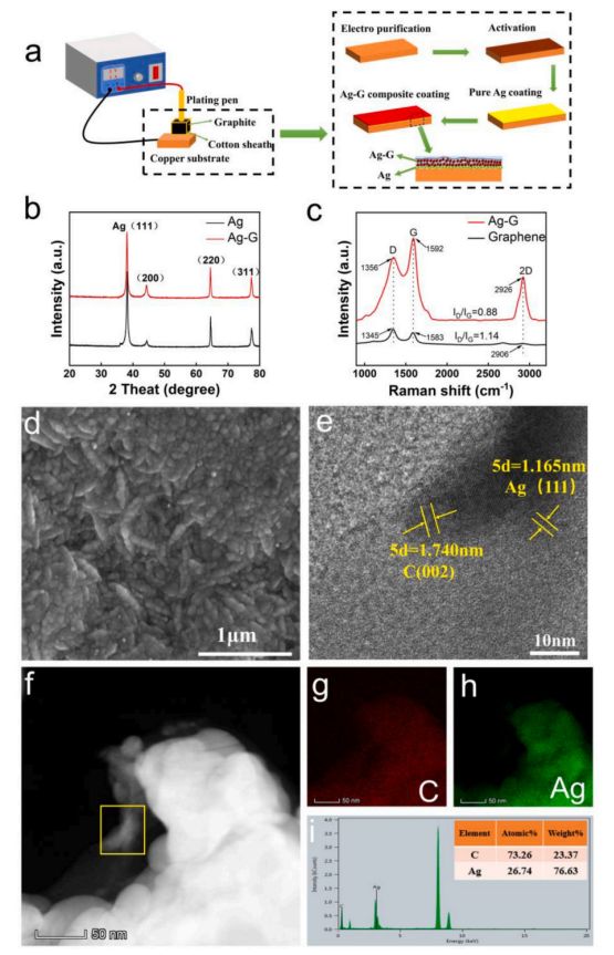 圖1. (a)通過復合刷鍍方法制造Ag-G復合涂層的工藝示意圖。(b) XRD圖譜。(c)拉曼光譜。