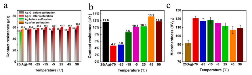 圖6. (a)在不同硫化溫度下硫化168小時前后,所制備涂層的接觸電阻。(b)在不同硫化溫度下,接觸電阻在168 h前后增加的百分比。(c)在不同溫度下硫化168 h后,純銀和Ag-G復合鍍層的顯微硬度。