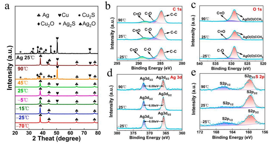 圖3. (a)在不同硫化溫度下168小時后,純Ag涂層和Ag-G復合涂層的XRD圖。(b)在硫化溫度為-25°C、25°C和90°C下168小時,Ag-G復合涂層的C 1s、(c) O 1s、(d) Ag 3d、(e) S 2p XPS光譜