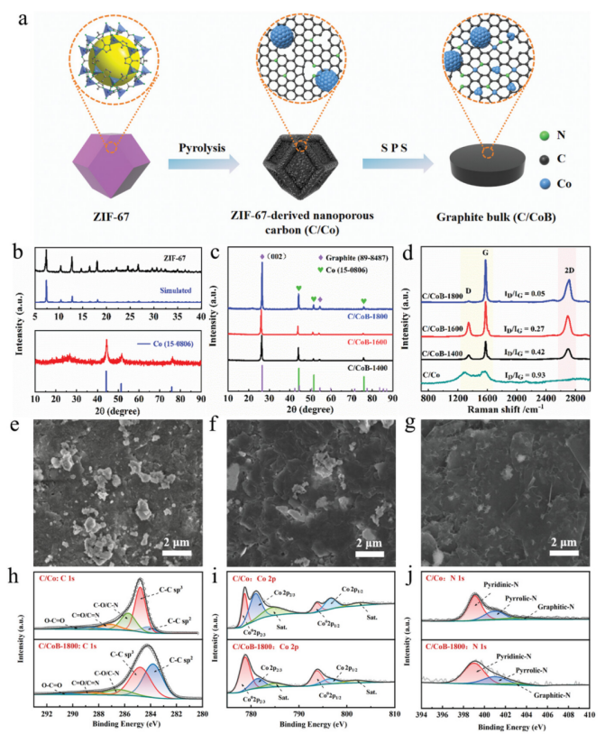 圖 1. a) C/CoB 制造過(guò)程示意圖。b) ZIF-67 和 C/Co 的 XRD 圖案。c) 在不同燒結(jié)溫度下制備的 C/CoB 的 XRD 圖案。d) C/CoB-1400、C/CoB-1600、C/CoB-1800 和 C/Co 的 ID/IG 值的拉曼光譜。e–g) C/CoB-1400、C/CoB-1600 和 C/CoB-1800 的橫截面 SEM 圖像。h–j) C/Co 和 C/CoB-1800 的 C 1s、Co 2p 和 N 1s XPS 光譜。