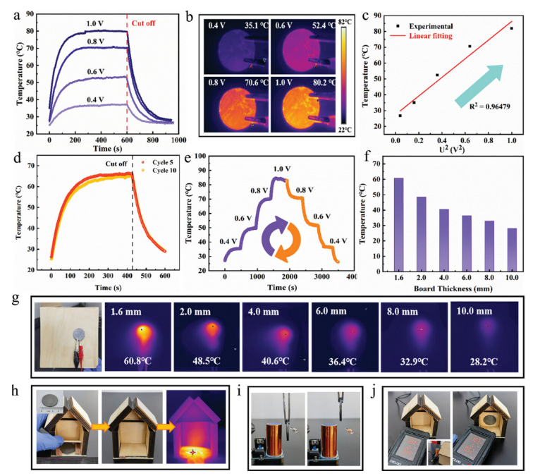 圖 5. a) 不同輸入電壓下C/CoB-1800的溫度-時(shí)間曲線(xiàn)。b) 不同輸入電壓下C/CoB-1800的紅外圖像。c) 實(shí)驗(yàn)數(shù)據(jù)和表面溫度與U2的線(xiàn)性擬合。d) 0.8 V下第5和10個(gè)周期C/CoB-1800的循環(huán)穩(wěn)定性。e) 梯度電壓變化下C/CoB-1800的表面溫度。f) 0.8 V通電5分鐘后木材厚度與表面溫度關(guān)系分布圖。g) 不同厚度木板背面表面溫度的紅外圖像。h) 用于模擬房屋木地板加熱器的塊體示意圖。i) 描繪白熾燈在特斯拉線(xiàn)圈影響下有無(wú)C/CoB-1800變化的圖像。j) 安裝C/CoB-1800前后房屋的電場(chǎng)和磁場(chǎng)值。