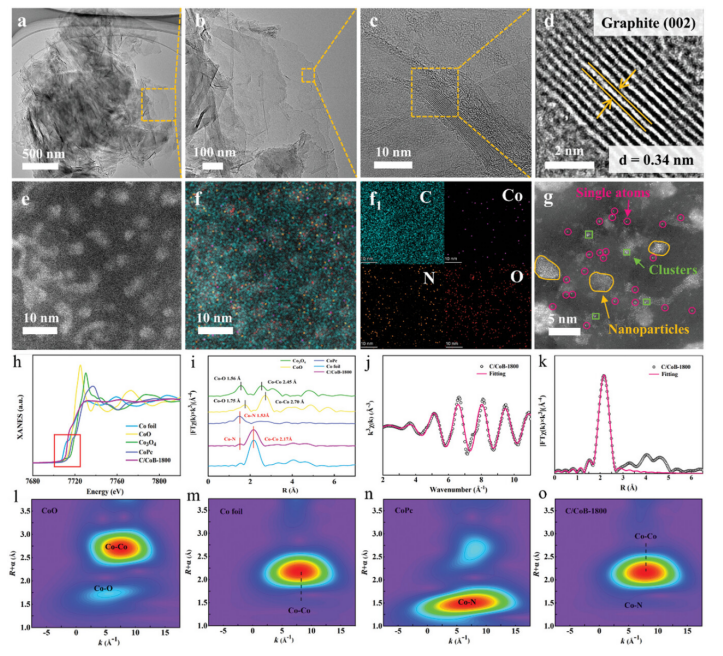 圖 2. (C/CoB-1800 的微觀結(jié)構(gòu)特征和化學(xué)結(jié)構(gòu)。a) TEM 圖像。b) 詳細(xì)放大的 TEM 圖像。c) HRTEM 圖像。d) 詳細(xì)放大的 HRTEM 圖像。e) 碳基質(zhì)區(qū)域的 HAADF-STEM 圖像。f-f1) Co、N、C 和 O 的元素映射圖像。g) Co 的詳細(xì)放大 HAADF-STEM 圖像。h) Co K 邊 XANES 光譜,i) Co 箔、CoPc、Co3O4、CoO 和 C/CoB-1800 在 R 空間中的 EXAFS 光譜。j) Co k3 ?(k) 振蕩曲線(xiàn),k) C/CoB-1800 的 EXAFS 光譜的傅里葉變換和相應(yīng)的擬合曲線(xiàn)。l–o) CoO、Co 箔、CoPc 和 C/CoB-1800 的小波變換 (WT)。