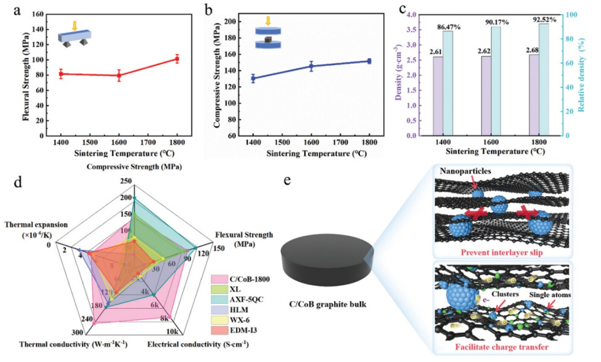 同時(shí)具有優(yōu)異電導(dǎo)率和強(qiáng)度的高性能塊狀石墨 (HPBG) 需求量很大,但它仍然至關(guān)重要且具有挑戰(zhàn)性。本文介紹了一種新方法,利用 MOF 衍生的納米多孔金屬/碳復(fù)合材料作為前體來(lái)規(guī)避這種傳統(tǒng)的權(quán)衡。所得的塊狀石墨由密集堆積的多層石墨烯片組成,這些石墨烯片用多種鈷形式(納米顆粒、單原子和簇)功能化,在各個(gè)方向上表現(xiàn)出前所未有的電導(dǎo)率(平面內(nèi):7311 S cm?¹,平面外:5541 S cm?¹)和優(yōu)異的機(jī)械強(qiáng)度(彎曲:101.17±5.73 MPa,壓縮:151.56±2.53 MPa)。Co 納米顆粒充當(dāng)自催化劑和粘合劑,通過(guò)放電等離子燒結(jié)促進(jìn)高度石墨化的石墨烯層之間的強(qiáng)層間粘附。石墨和 Co 之間的強(qiáng)納米界面在石墨烯納米片之間創(chuàng)建了關(guān)鍵橋梁,促進(jìn)了高效的電子遷移,并提高了組裝的塊狀納米復(fù)合材料的強(qiáng)度和剛度。利用這些卓越的性能,實(shí)際演示凸顯了這種堅(jiān)固材料在需要卓越電磁干擾屏蔽和高效加熱的應(yīng)用中的巨大潛力。一種創(chuàng)新的方法有效地將電導(dǎo)率與機(jī)械性能分離,為創(chuàng)建適合不同應(yīng)用領(lǐng)域的 HPBG 鋪平了道路。