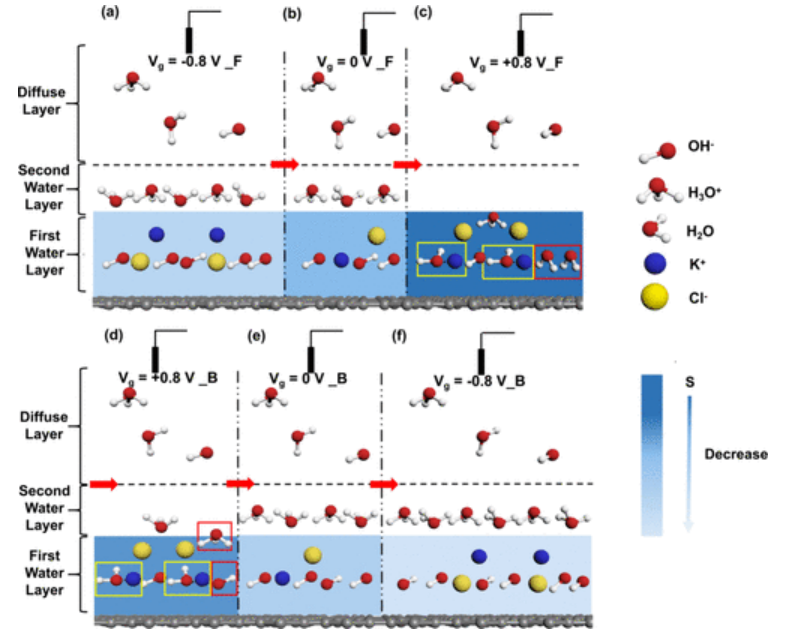 圖7.SF-GFET與1μM KCl電解質溶液在不同柵極電壓下的界面演變示意圖。右邊的色條顯示第一個水層中懸掛的水分子“S”的布居程度。懸水(S)分布在深藍色時增強,而在淺藍色時減弱。為清楚起見,2D HBN和離子水合簇僅以離子狀態表示:(a)前向掃描路徑處的V