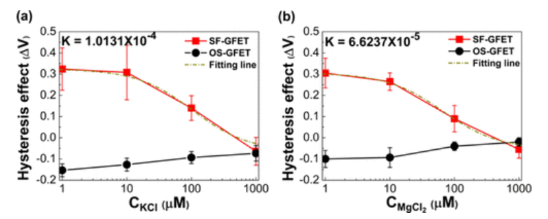 g;(e) SF-GFET和OS-GFET在1μM和1 mM KCl水溶液濃度下隨柵極電壓階躍增加的滯后效應。