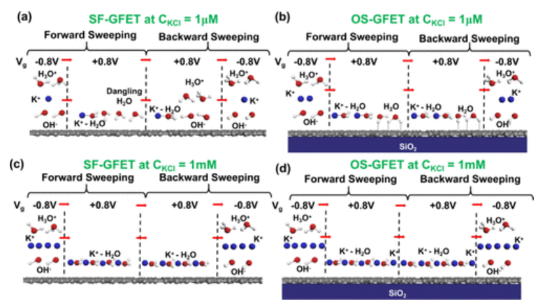 圖8.SF-GFET和OS-GFET在1μM和1 mM KCl環境中懸垂分子演化的比較。為清楚起見,2D HBNS和離子水合團簇僅以離子狀態表示:(a)SF-GFET和1μM KCl環境。(b) OS-GFET具有1μM KCl環境。(c) SF-GFET具有1 mM KCl環境。(d) OS-GFET具有1 mM KCl環境。