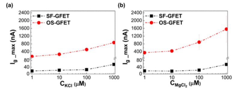 圖4. SF-GFET和OS-GFET在1、10和100μM電解液中石墨烯輸運行為的比較。(a) SF-GFET和OS-GFET在KCl水溶液中的最大柵電流。(b) SF-GFET和OS-GFET在MgCl
