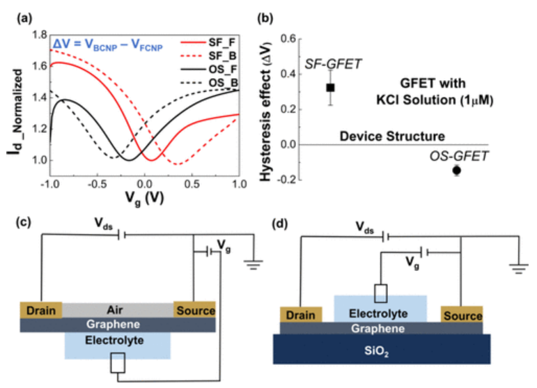 g曲線(前向掃描SF_ F:SF-GFET;后向掃描SF_B:SF-GFET;前向掃描OS_F:OS-GFET;后向掃描OS_B:OS-GFET)。(b) SF-GFET和OS-GFET的滯后效應(ΔV)的實驗結果。(c) SF-GFET實驗裝置示意圖。(d) OS-GFET實驗裝置示意圖。
