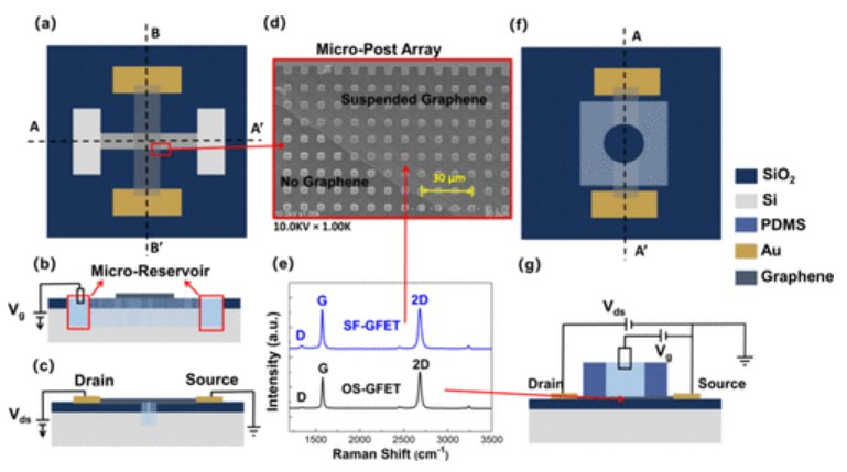 圖1. SF-GFET/OS-GFET裝置示意圖和測量圖。(a) SF-GFET設備俯視圖。(b) SF-GFET裝置橫截面A–A′方向視圖。(c) SF-GET裝置橫截面B–B′方向的視圖。(d) SF-GFET器件中石墨烯懸浮在微孔陣列上的SEM圖像。(e) SF-GFET器件中懸浮石墨烯(藍線)和OS-GFET器件中支撐石墨烯(黑線)的拉曼光譜。(f) OS-GFET設備的俯視圖。(g) OS-GFET設備橫截面C–C′方向視圖。