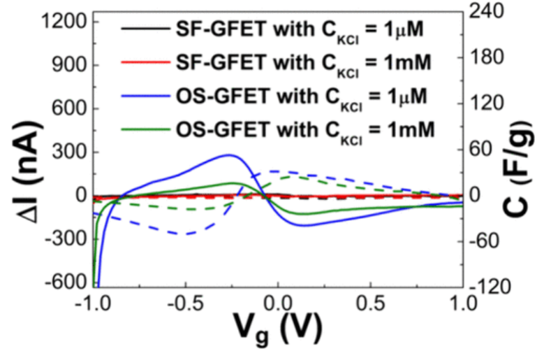 圖9.比較了SF-GFET和OS-GFET-GFET在1μM和1 mM KCl環境中的凈場效應電流(ΔI)和界面電容(C)。對于SF-GFET(疏水表面),凈場效應電流(ΔI)很小;相比之下,OS-GFET(親水表面)在柵電壓掃描過程中表現出峰值電流行為。