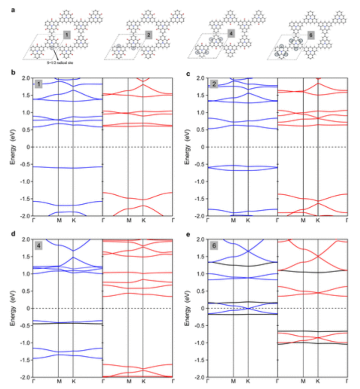 圖5. 自由基密度對KG能帶結構的影響。(a) KG的結構構型,每單位細胞分別有一個、兩個、四個和六個自由基。(b) –(e),計算了鐵磁(FM)態的能帶結構,顯示了α(藍色)和β(紅色)自旋通道。該圖突出了自由基濃度對自旋極化、對稱破缺以及Dirac錐和平帶(d和e中的黑線)的消失和重組的影響。