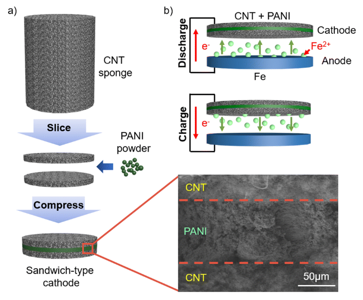 Fig 1. (a) 通過切割圓柱形海綿狀 CNT 并夾入 PANI 粉末來制造陰極。SEM 圖像顯示了 CNT 層之間的 PANI 浸漬層。(b) 放電和充電過程的示意圖以及相應的 Fe 離子和電子的流動。