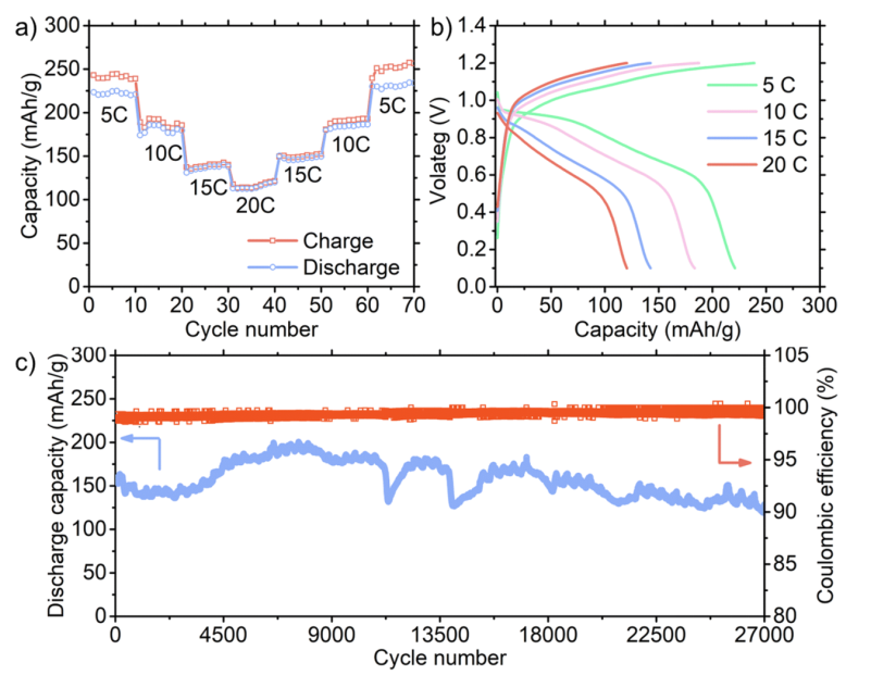 Fig 4. (a) 在不同 C 速率下,8%活性材料負載的 PANI 夾層 CNT 陰極的全電池的比容量(1C = 每克 300 mA)。(b) 在不同 C 速率下的相應充放電電壓曲線。(c) 在 15C 下,8 wt%活性材料負載電池的放電比容量和庫侖效率隨循環次數的變化。