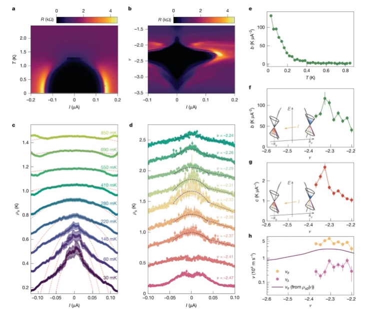 非線性邁斯納效應(yīng)與節(jié)點超導特征a. 最佳摻雜點(ν = -2.34)附近直流電阻R隨電流偏置I