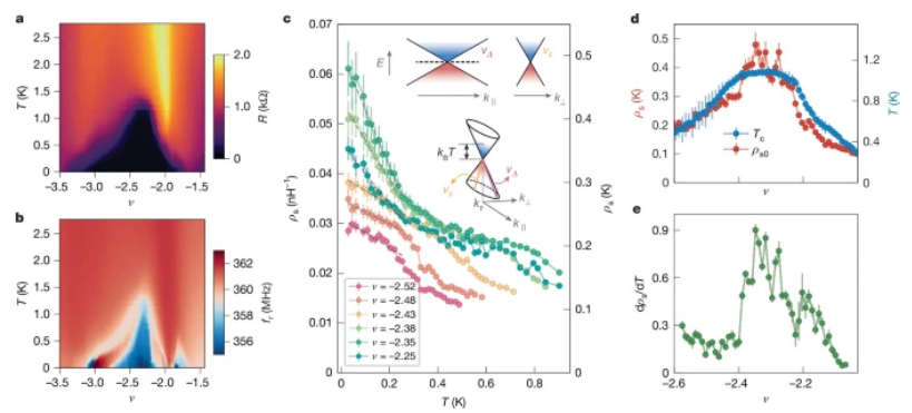 溫度與摻雜依賴的超流剛度特性a-b. 莫爾填充因子ν與溫度T二維相圖:(a) 直流電阻R的演化規(guī)律,(b) 諧振器頻率