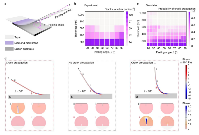 影響機械剝離金剛石膜質量的因素a:在剝離力 F 和剝離角度 θ 作用下,從襯底上剝離金剛石膜的示意圖。