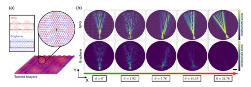 圖1. 系統設置和綁定傳輸。(a) NPG(紅色)、石墨烯(藍色)和扭曲的 NPG/石墨烯雙層的原子結構。黑叉和黑點分別表示旋轉軸和注射部位。(b) 能量 E = −0.4 eV 的扭曲 NPG/石墨烯雙層中的實空間鍵傳輸圖。頂行:NPG 層。底行:石墨烯層。紅點表示 NPG 層中的進樣點。比例尺為 10 nm。