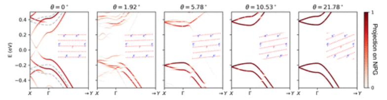 圖2. NPG/石墨烯在不同 θ 處的帶結構,投影在 NPG 上并展開到其布里淵區。展開的條帶在沿 (X → Γ) 和沿 (Γ → Y) NPG 帶軸的方向上表示。單層 NPG 的能帶結構在對應于 θ = 0°(灰色虛線)的面板中繪制為參考。插圖顯示了石墨烯的 K/K′ 點(藍色)和 NPG 的延伸 Γ 點在折疊前在廣義動量空間中旋轉了相應的角度(紅色)。