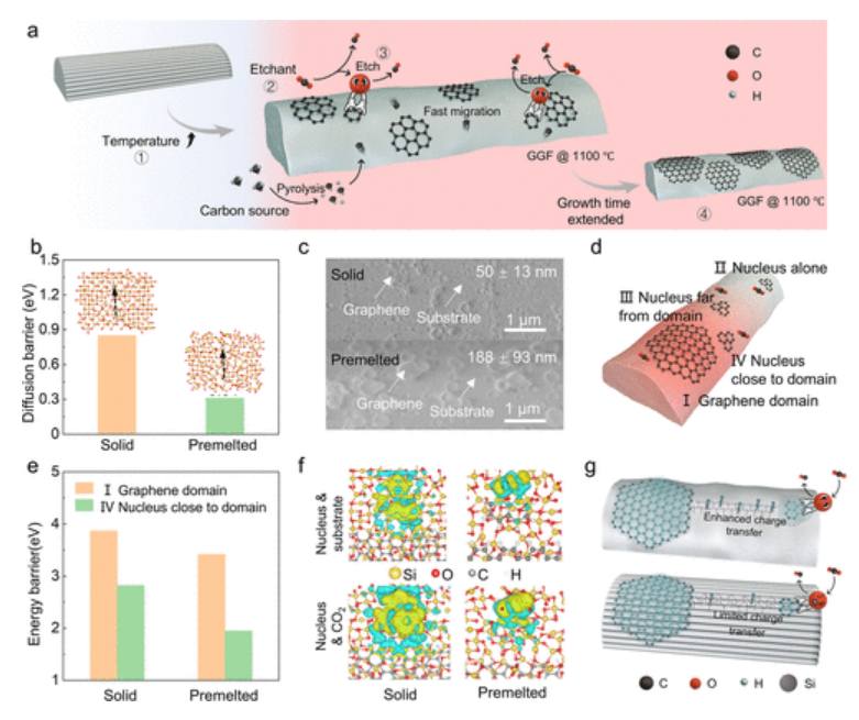 圖1. PSE 策略的設計和理論研究。(a) PSE 策略示意圖。(b) 活性炭種類 (CH3) 在固體和預熔化基材上的擴散屏障。(c) 石墨烯生長在固體和預熔化基板上的 SEM 圖像。生長條件:∼1100 °C,大氣壓,CH4/H2 = 7:100 sccm,∼6 小時。(d) 石墨烯結構域和細胞核模型的示意圖。(e) 面板 (d) 中 CO2 蝕刻結構 I 和 IV 在固體和預熔化基材上的能壘。(f) 在固體和預熔化表面上,圖 (e) 中結構 IV 的原子核與襯底之間以及原子核與 CO2 之間的電荷密度差 (CDD),其中綠色和黃色區域分別表示電子耗盡和積累。(g) 分別在預熔化和固體表面上進行增強和有限電荷轉移的示意圖。