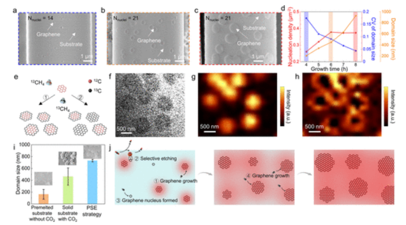 圖3. PSE 策略中石墨烯的生長行為。在 (a) ∼4 h、(b) ∼6 h 和 (c) ∼8 h 的生長時間獲得的石墨烯結構域的 SEM 圖像。生長條件:∼1100 °C,大氣壓,CH4/H2/CO2 = 10:100:4 sccm。(d) 石墨烯疇大小的成核密度和 CV 隨生長時間的演變。(e) 碳同位素標記的石墨烯生長示意圖。(f) 使用碳同位素標記技術生長的石墨烯的 SEM 圖像。生長條件:∼1100 °C,大氣壓,CH4/H2/CO2 = 10:100:4 sccm,第一個 ∼6 小時 12CH4,最后 ∼2 小時 13CH4。(g) 12C-石墨烯的 D 波段強度在 1330-1370 cm-1 的波數范圍內和 (h) 13C-石墨烯在 1275-1315 cm-1 的波數范圍內的強度的拉曼映射。(i) 在沒有 CO2 輔助的預熔襯底上生長的石墨烯的疇尺寸統計結果,在 CO2 輔助下在固體襯底上生長,以及在 CO2 輔助下在預熔襯底上生長的 PSE 策略的統計結果。插圖:對應的 SEM 圖像。生長條件:∼1100 °C,大氣壓,∼6 h,CO2 輔助的固體基質和 PSE 策略:CH4/H2/CO2 = 12:100:4 sccm;無 CO2 輔助的預熔基材:CH4/H2 = 7:100 sccm。(j) PSE 策略中石墨烯生長機制的示意圖。