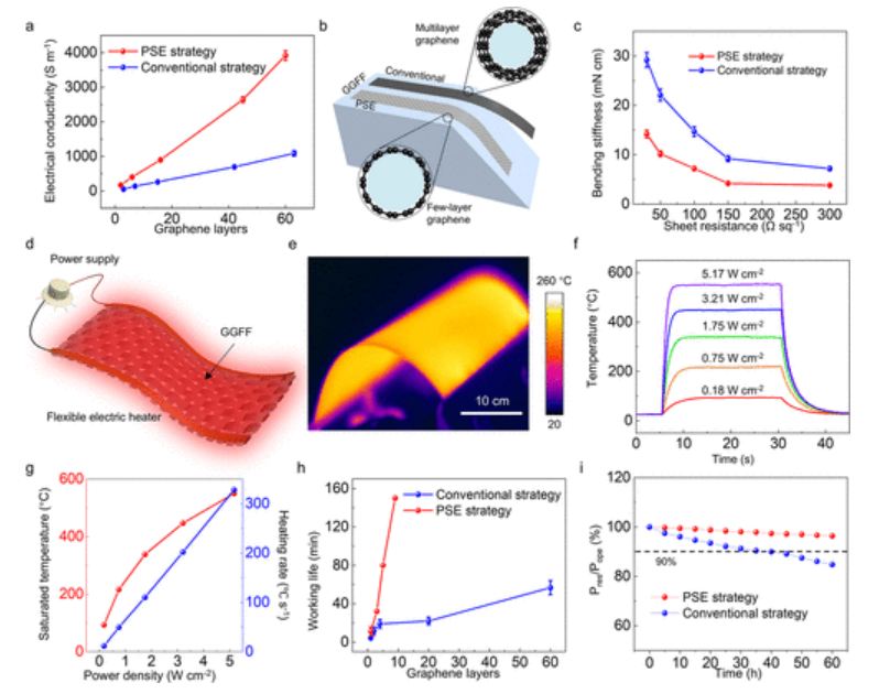 圖4. 石墨烯層和 GGFF 柔性電加熱器的導電性。(a) 用 PSE 和常規策略制造的石墨烯層的電導率。在 PSE 和傳統策略中制造的 GGFF 的 (b) 柔韌性差異和 (c) 測試的彎曲剛度示意圖。(d) GGFF 柔性電加熱器示意圖。(e) GGFF 柔性電加熱器的紅外圖像。(g) GGFF 加熱器在不同功率密度下的溫度曲線,以及 (f) 相應的飽和溫度和加熱速率。(h) 具有不同石墨烯層數的 GGFF 加熱器的工作壽命和 (i) 老化測試。