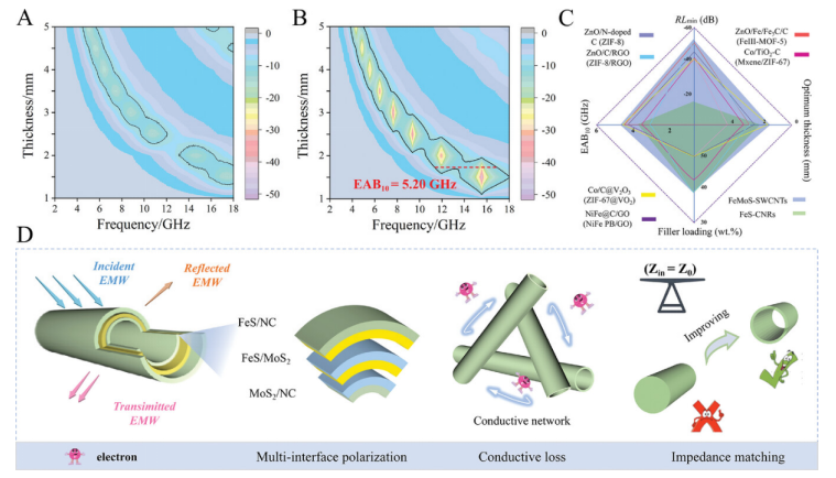 Fig 8. A)FeS - 碳納米棒反射損耗(RL)值的三維示意圖;B)FeMoS - 單壁碳納米管反射損耗(RL)值的三維示意圖;C)FeMoS - 單壁碳納米管與其他已報道的金屬 - 有機框架(MOF)衍生吸收劑綜合性能的對比。