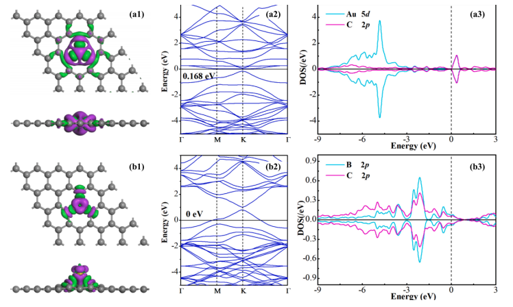 圖3. Au-石墨烯(a1)-(a3)和B石墨烯(b1)-(b3)的CDD、BS和ADOS。