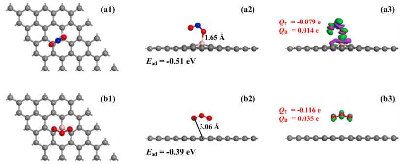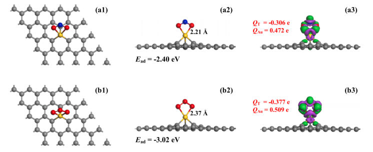 3在Au -石墨烯上的吸附為化學吸附,而在B-石墨烯上的吸附為物理吸附。Au-石墨烯和B-石墨烯在氣體吸附中的電子特性表明,Au-石墨烯對O