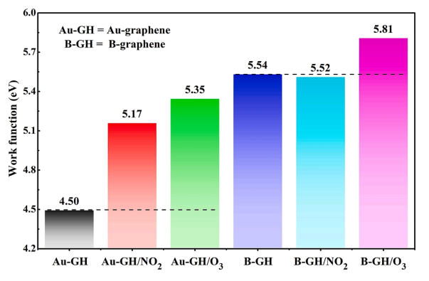 圖7. Au-和B石墨烯及其氣體吸附體系的WF。