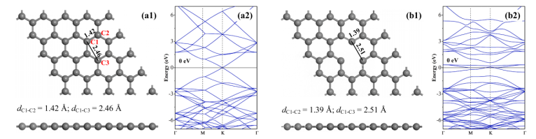 圖1. (a1)-(a2)原始石墨烯的構型和BS,以及(b1)-(b2)空位缺陷石墨烯的構型和BS。