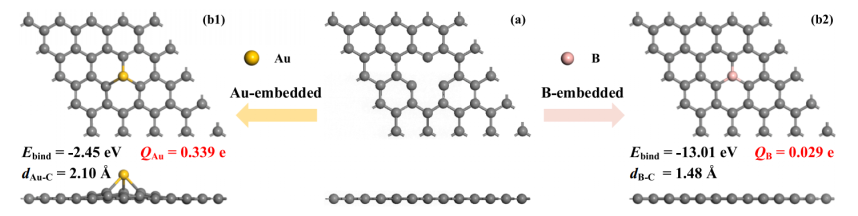 圖2. 空位缺陷石墨烯上的金和硼嵌入行為。