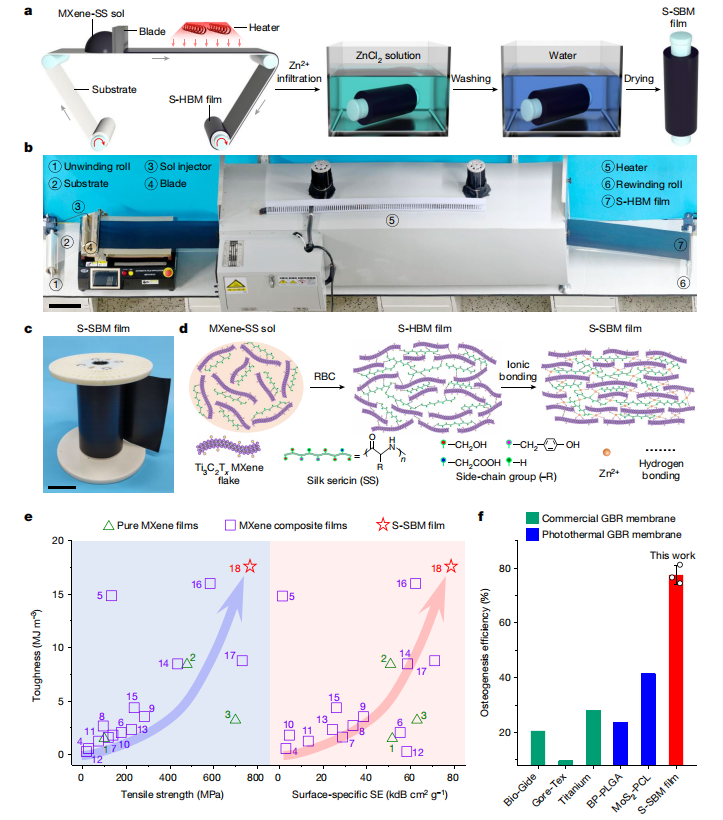 本研究創新性地結合卷對卷輔助刮刀涂布(RBC)與順序橋接工藝,開發出可規?;苽涞母咝阅躆Xene薄膜(S-SBM),在機械性能、功能集成及生物醫學應用領域取得突破性進展。