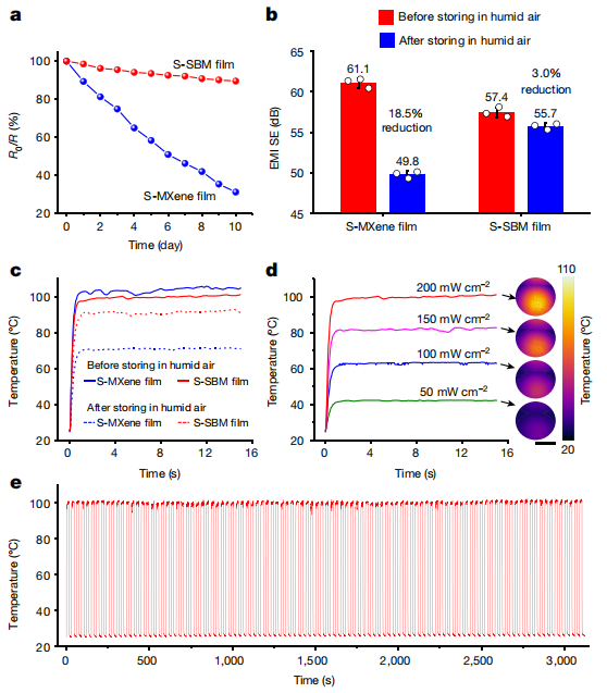 圖3 | S-MXene與S-SBM薄膜的氧化穩定性與光熱轉換性能。a. 在100%相對濕度的潮濕空氣中,S-MXene與S-SBM薄膜的電導率保持率隨時間的變化。S-SBM薄膜的電導穩定性顯著優于S-MXene(10天后保持率>90%),表明其抗濕氧化能力更強。b. 2–18 GHz頻段內薄膜的平均電磁干擾屏蔽效能(EMI SE)對比(n=3獨立樣本):原始S-SBM薄膜的SE為78 dB,10天后僅下降2.3%,而S-MXene薄膜下降達15.7%。c. 近紅外(NIR)光照強度200 mW cm?²下,薄膜溫度隨時間的變化:S-SBM薄膜在10天后仍能快速升溫至112°C(與初始狀態相差<5°C),光熱穩定性優于S-MXene(升溫能力下降22%)。d. 不同NIR光強度(50–200 mW cm?²)下S-SBM薄膜的溫度響應曲線及15秒時的紅外熱像圖(標尺1 cm):光強度與溫升呈線性關系(200 mW cm?²時15秒達85°C),驗證其光熱轉換效率可控性。e. 200 mW cm?²循環開關輻照下,S-SBM薄膜溫度響應曲線顯示:經過5次循環后,峰值溫度波動<3%,表明材料具有優異的光熱循環穩定性。