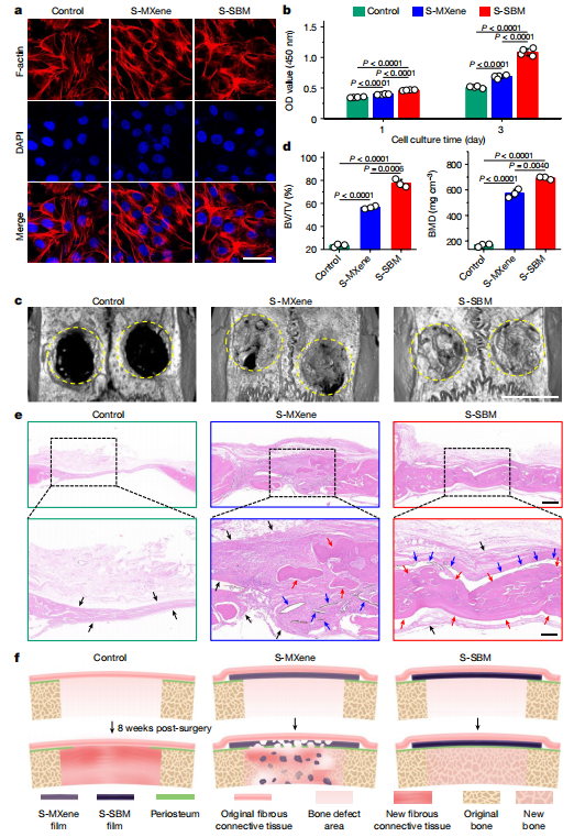 圖4 | S-MXene與S-SBM薄膜的生物相容性及體內骨再生性能。a. 對照組、S-MXene組與S-SBM組中骨髓間充質干細胞(BMSCs)培養1天后的細胞骨架熒光圖像(紅色:F-actin;藍色:細胞核)。比例尺:50微米。實驗獨立重復3次,結果一致。b. BMSCs在對照組、S-MXene組與S-SBM組中培養1天和3天后的細胞存活率(n=4個生物學獨立樣本)。c. 大鼠顱骨缺損區域修復8周后的三維重建微型計算機斷層掃描(micro-CT)圖像:S-SBM組顯示更完整的骨橋接(箭頭)與礦化結構。d. 骨體積分數(BV/TV)與骨密度(BMD)定量分析(n=3個生物學獨立樣本):S-SBM組的BV/TV較對照組提高2.1倍(p<0.01),BMD達到0.32 g/cm³(接近天然骨水平)。e. 蘇木精-伊紅(H&E)染色顯示:SBM組缺損區新生骨組織(NB)占比達82%±3%,且無顯著炎癥反應;S-MXene組可見局部纖維包裹(黃色虛線)。