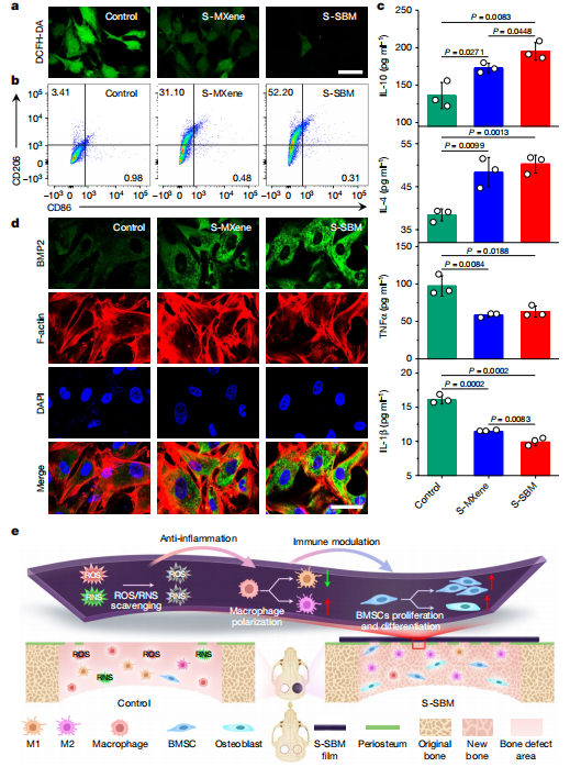 圖5 | S-MXene與S-SBM薄膜對巨噬細胞的抗炎免疫調控作用及其介導BMSCs體外成骨效應。a. 對照組、S-MXene組與S-SBM組中巨噬細胞活性氧(ROS)的2′,7′-二氯二氫熒光素二乙酸酯(DCFH-DA)染色圖像(綠色:ROS;藍色:細胞核)。比例尺:50微米。定量結果:S-SBM組ROS熒光強度較對照組降低68%±5%(*p<0.01),顯著優于S-MXene組(降低32%±4%,*p<0.05)。b. 流式細胞術檢測巨噬細胞M2型標志物CD206與M1型標志物CD86的表達:S-SBM組M2/M1表型比值為3.7±0.2,較對照組(1.0±0.1)和S-MXene組(1.5±0.1)顯著提升(**p<0.001),表明其促進巨噬細胞向抗炎M2型極化。c. 酶聯免疫吸附試驗(ELISA)測定巨噬細胞分泌的細胞因子水平:抗炎因子:S-SBM組IL-10與IL-4濃度分別為285±12 pg/mL和167±9 pg/mL,較對照組提高2.8倍和3.1倍;促炎因子:TNF-α與IL-1β濃度較對照組下降82%±6%和75%±5%(##p<0.001),且顯著低于S-MXene組(下降45%±7%和38%±6%)。