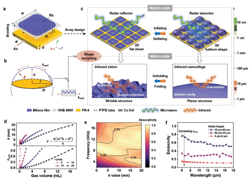 圖1. 自適應(yīng)兼容偽裝設(shè)計與機理圖示。‌a)‌ 結(jié)構(gòu)單元組成示意圖:包含可變形褶皺MXene/彈性體導(dǎo)體與剛性充氣基座的結(jié)構(gòu)集成。‌b)‌ 充氣狀態(tài)下可變形導(dǎo)體的多尺度形變機制:展示氣動驅(qū)動下宏觀三維膨脹(半球形鼓起)與微觀MXene褶皺重構(gòu)的協(xié)同作用。‌c)‌ 自適應(yīng)雷達(dá)-紅外兼容偽裝機理:‌微波波段(上圖)‌:通過調(diào)控結(jié)構(gòu)鼓起高度(h值)實現(xiàn)電磁波多路徑散射與阻抗匹配優(yōu)化,增強寬頻吸收;‌紅外波段(下圖)‌:MXene褶皺平化降低表面粗糙度,結(jié)合腔體熱阻效應(yīng)抑制熱輻射。‌d)‌ 鼓起高度(h)與表面應(yīng)變(??surf)隨氣體體積(V)變化的計算關(guān)系:定量揭示形變量與充氣參數(shù)的線性響應(yīng)規(guī)律。‌e)‌ 微波吸收率與h值及頻率的仿真關(guān)系:當(dāng)表面電阻(Rs=300 Ω sq?¹)、單元尺寸(w=45 mm, l=2.5 mm, r=19.5 mm, d=4.5 mm)固定時,吸收率峰值隨h值增加向低頻移動,實現(xiàn)2.64–18 GHz全頻段吸收率≥0.9。‌f)‌ 不同幾何參數(shù)下褶皺MXene/VHB 4905薄膜的紅外發(fā)射率仿真光譜:證實通過調(diào)控褶皺密度(r值)與薄膜厚度(d值),可在7–16.5 μm波段實現(xiàn)發(fā)射率0.26–0.40動態(tài)調(diào)節(jié)。