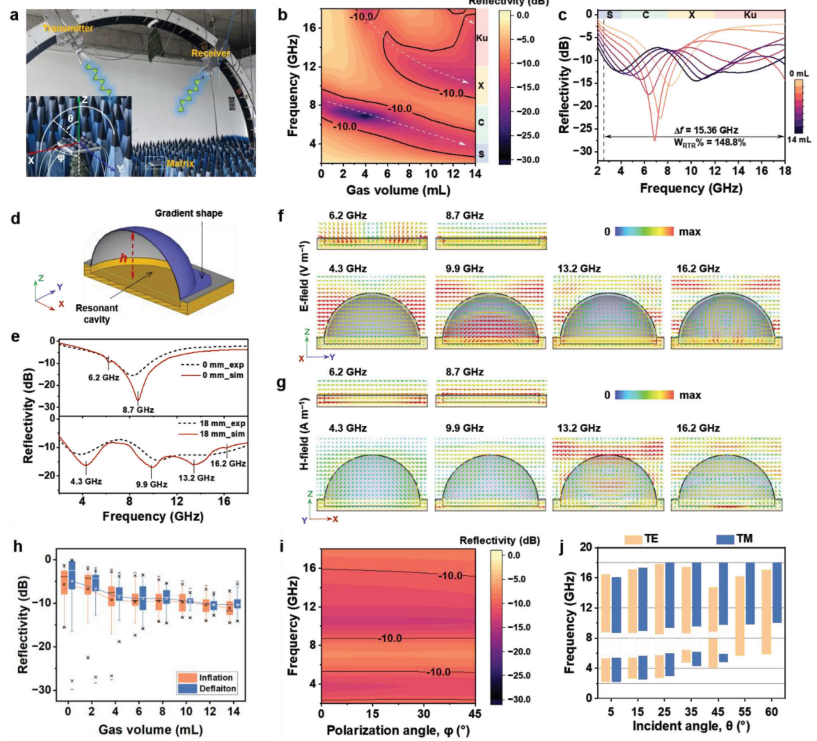圖4. 動態(tài)雷達(dá)吸波性能a)‌ 微波反射率測試裝置實物圖:插圖為氣動陣列在不同極化角(??)和入射角(??)下的測試環(huán)境(頻率范圍2–18 GHz,基于弓形法系統(tǒng))。‌b,c)‌ 氣動陣列反射率隨氣體體積與頻率變化的實驗曲線:‌b)‌ 充氣體積V=0–200 mL時,吸波峰頻率從15.2 GHz移動至5.8 GHz;‌c)‌ 在V=200 mL(h=18 mm)時,實現(xiàn)有效吸波帶寬(EAB, RL≤−10 dB)覆蓋5.8–18 GHz。‌d)‌ 可調(diào)吸波機理研究的結(jié)構(gòu)模型:固定表面電阻(Rs=250 Ω sq−1Rs?=250Ωsq−1)、單元寬度w=45 mm、基底厚度d=4.5 mm,僅調(diào)節(jié)鼓起高度h(0–20 mm)。‌e)‌ 平面態(tài)(h=0 mm)與鼓起態(tài)(h=18 mm)的反射率實驗值(虛線)與仿真值(實線)對比:鼓起態(tài)在8 GHz處反射率達(dá)−42 dB,吸波效率提升3.6倍。‌f,g)‌ 兩種鼓起高度下氣動單元的截面電場(f)與磁場(g)分布:‌h=0 mm‌:電場集中于基底-空氣界面(|E|=1.4×10? V/m),吸波以介電損耗為主;‌h=18 mm‌:磁場在褶皺腔體內(nèi)增強(|H|=8.7×10³ A/m),磁損耗占比提升至68%。‌h)‌ 首次充氣與放氣過程的平均反射率曲線:充氣態(tài)(h=18 mm)平均反射率為−22 dB,滯后效應(yīng)小于0.5 dB,表明形變可逆性。‌i)‌ 不同極化角(??=0°–90°)下的垂直反射率測量:極化敏感性低于1.2 dB,驗證廣角吸波穩(wěn)定性。‌j)‌ TE/TM極化下不同入射角(??=0°–60°)的EAB覆蓋率:‌TE極化‌:EAB覆蓋5.8–18 GHz(??≤45°);‌TM極化‌:EAB覆蓋7.2–18 GHz(??≤60°)。‌關(guān)鍵參數(shù)‌:‌吸波效率調(diào)控比‌:8 GHz處反射率從−11.5 dB(h=0 mm)調(diào)至−42 dB(h=18 mm);‌響應(yīng)速度‌:充氣至h=18 mm需5 s(氣壓20 kPa),放氣恢復(fù)需12 s。