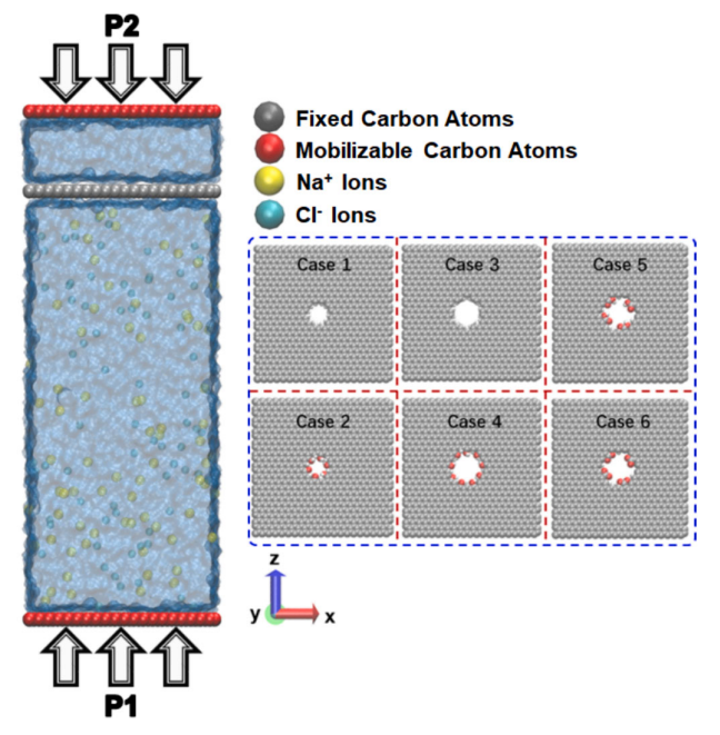 圖1. (左)初始模型示意圖;(右)六種不同孔徑和功能化修飾的納米孔結構