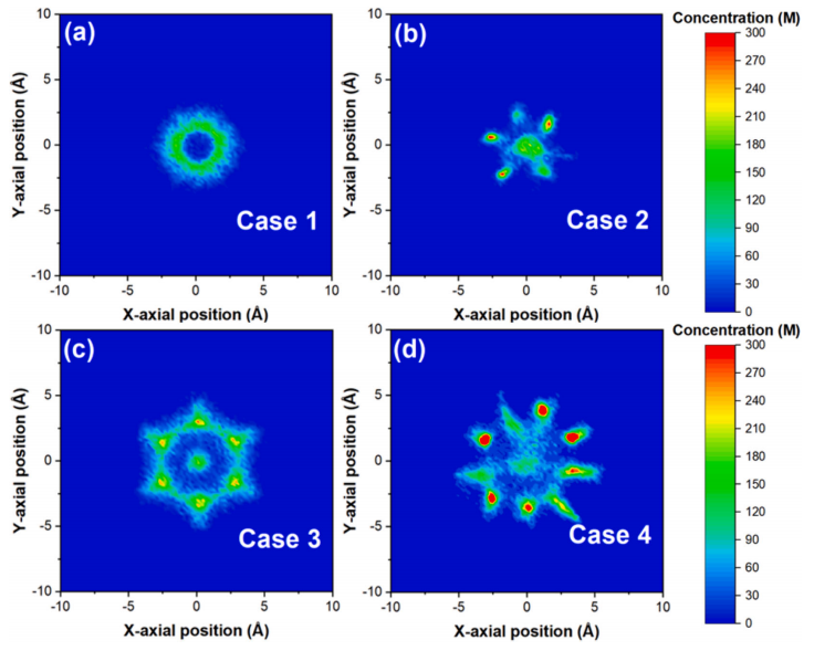 圖4. 水分子沿X-Y方向二維濃度分布的對比。(a) Case1: G0-CH(小孔徑); (b) Case2: GO-COH(小孔徑); (c) Case3: GO-CH(大孔徑); (d) Case4: GO-COH(大孔徑)